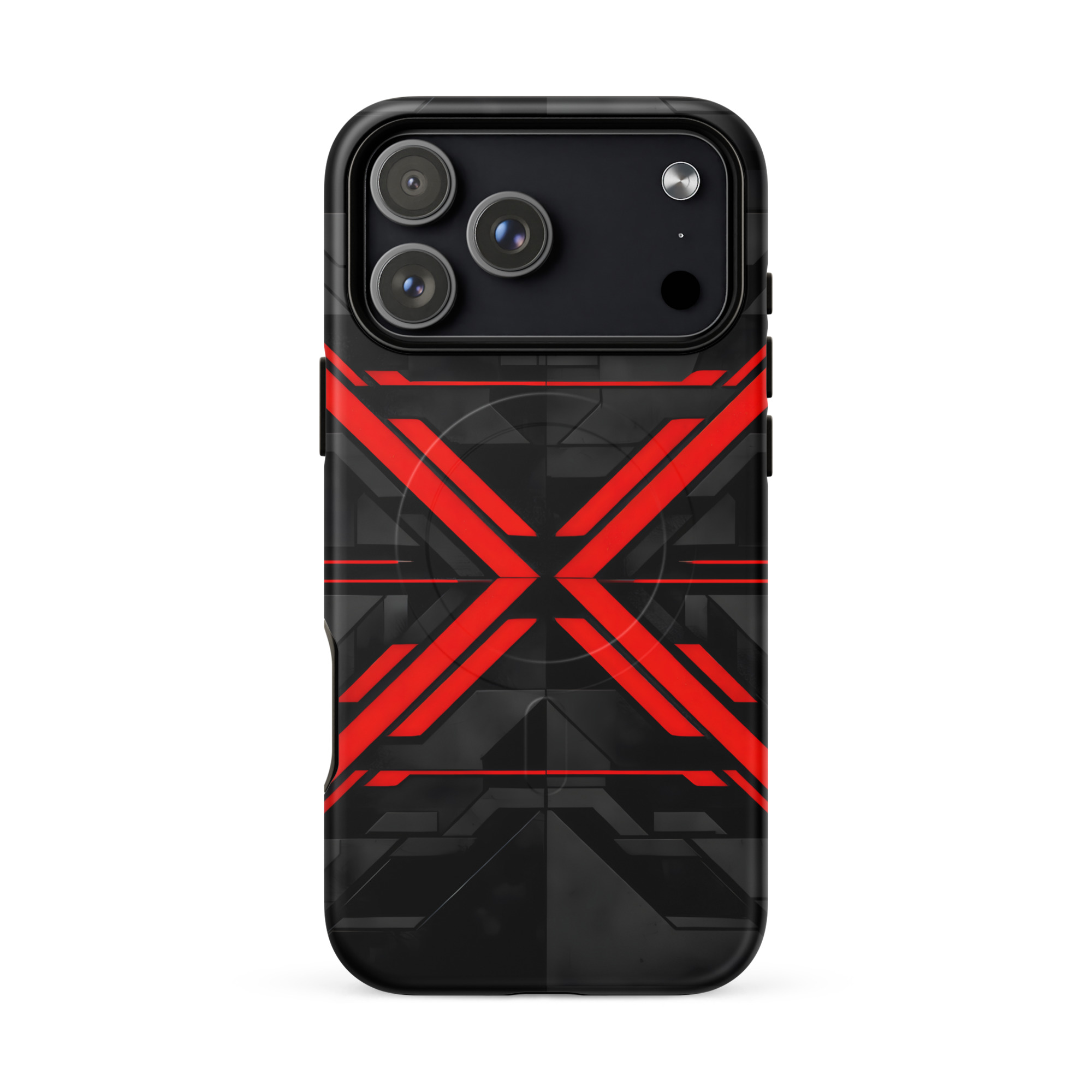 A bold red X case built for cyberpunk, gaming, and techwear aesthetics.