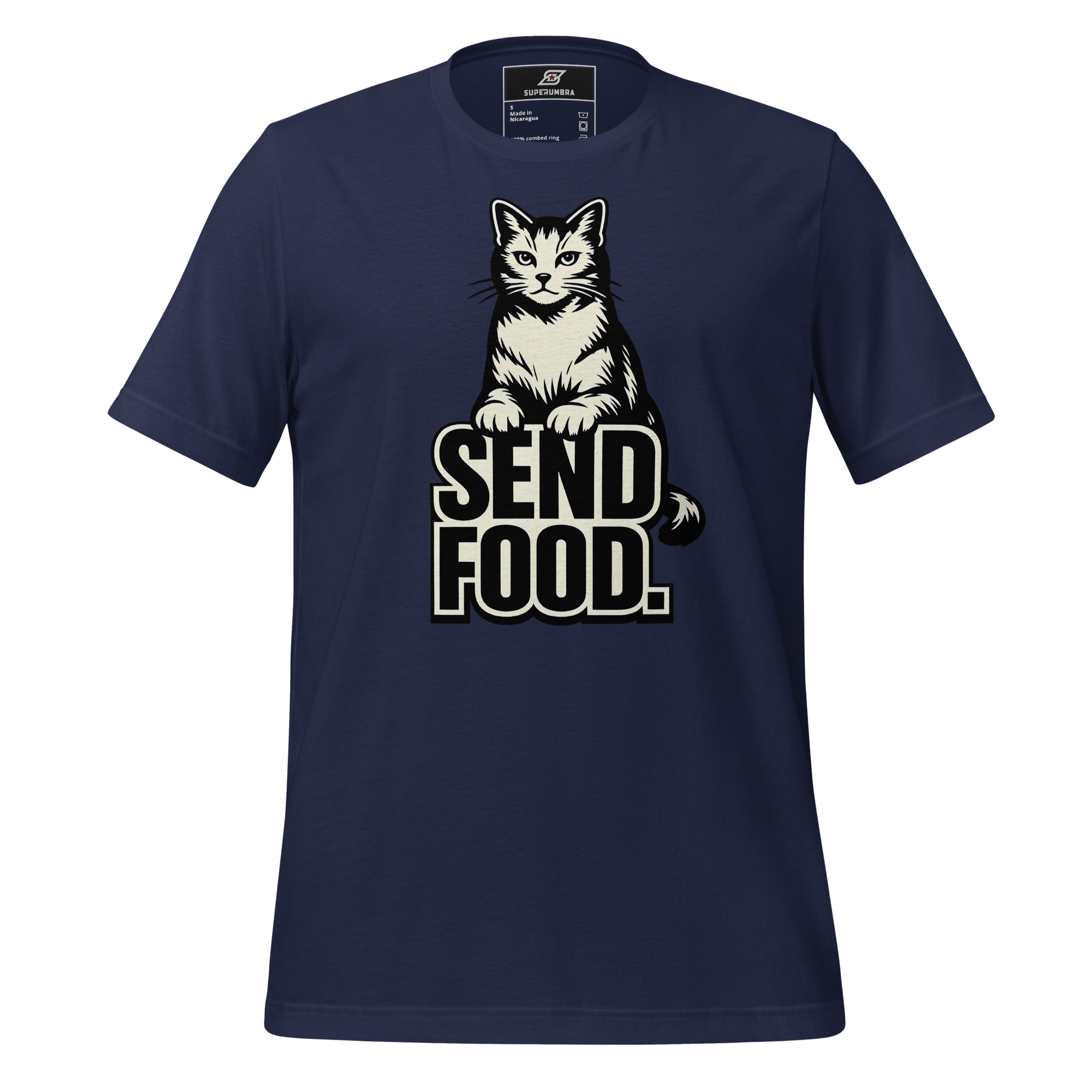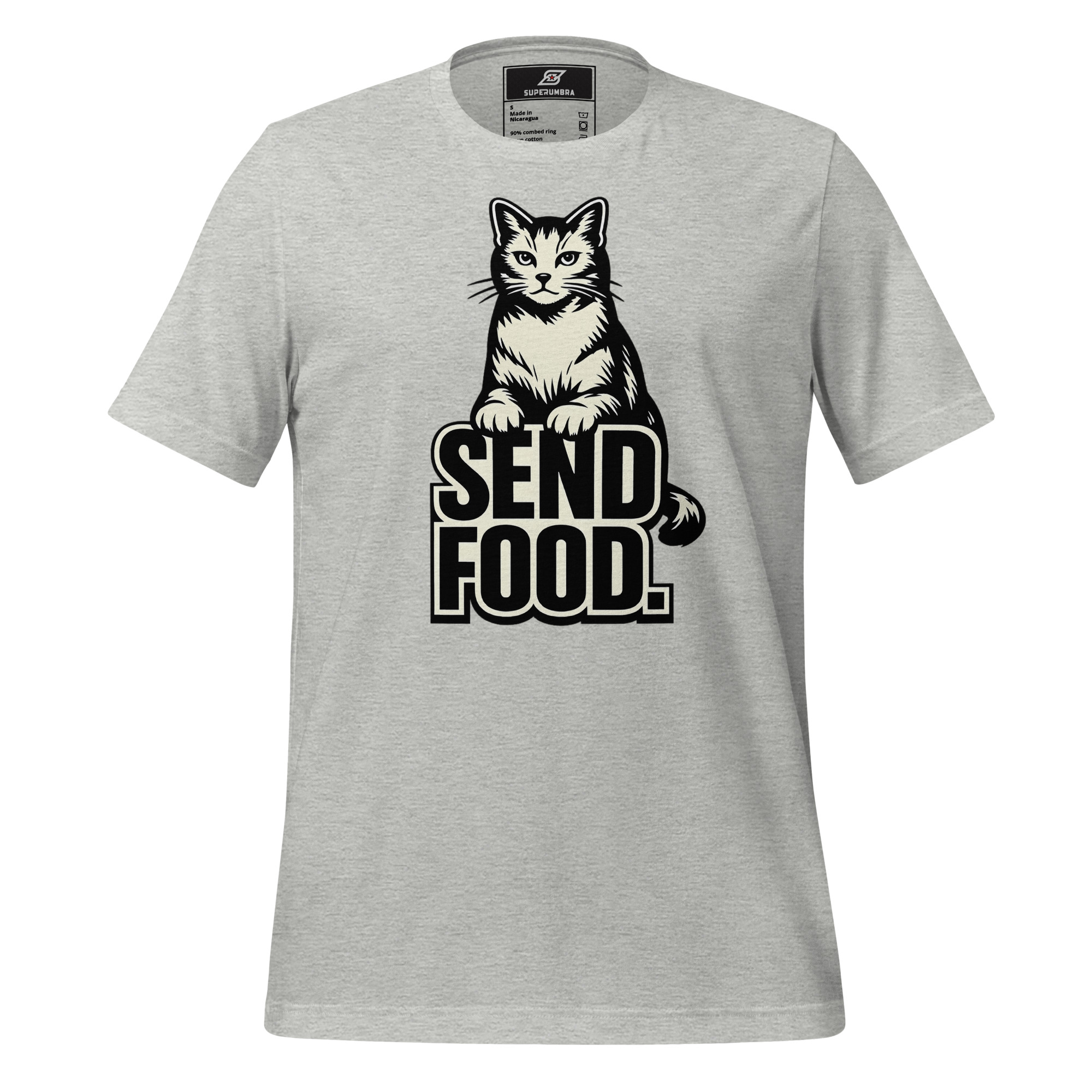 A striking black tee with a confident cat perched above the words ‘SEND FOOD.’ in bold, block letters. The feline’s gaze is direct, paws resting on the text, making the message impossible to ignore.
